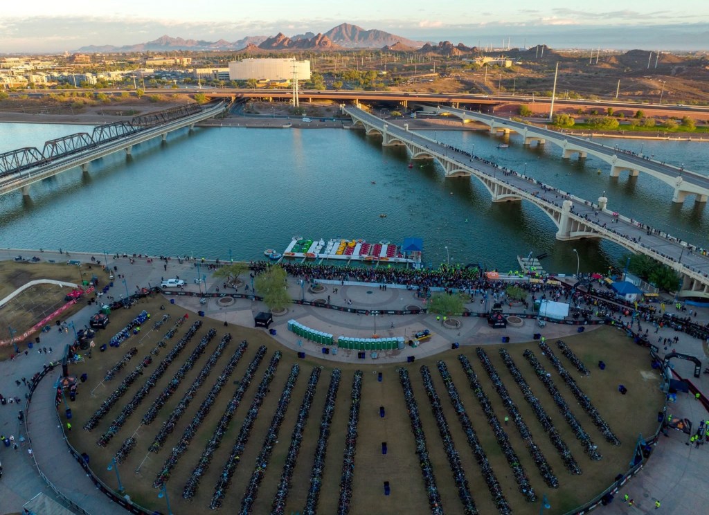 The swim. Nerves had me putting my wetsuit on backwards in practice. “Good to get those race-day nerves out of the way now,” another athlete said with a smile. Race day water temperature was 67 degrees, cold enough for a wetsuit but warm enough that booties weren’t allowed. I needle-dived feet first into the Tempe Salt River and started the 2.4-mile swim. The straightaways felt endless, and the pull of the wetsuit was a constant reminder that I was moving forward.